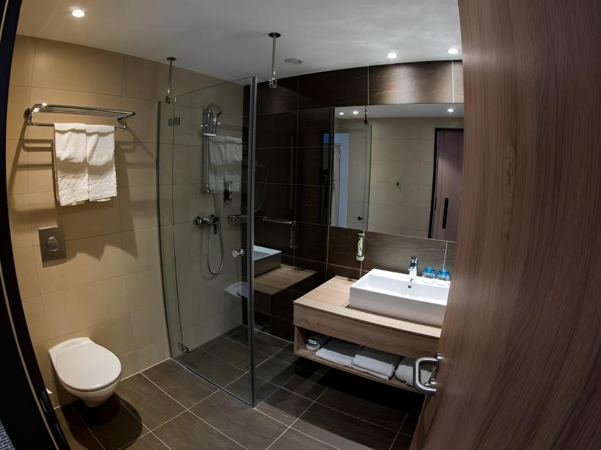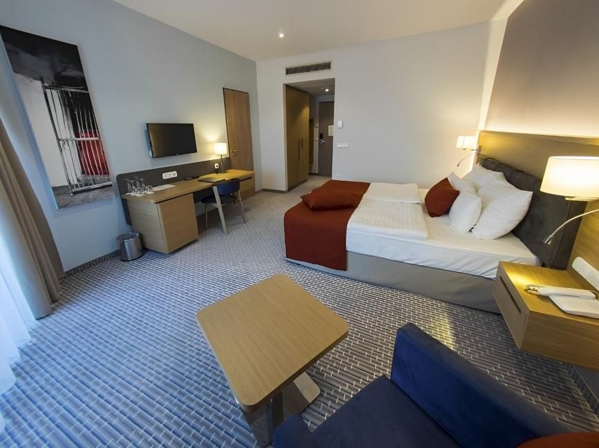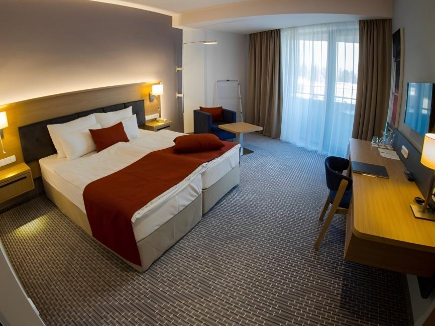 V krásném moderním hotelu najdete komfortní ubytování v jedinečně zařízených pokojích typu Standard, Superior, Superior plus a luxusních apartmánech. Součástí základní výbavy je minibar, trezor, televize a klimatizace. V prostorných pokojích typu Standard a Superior lze umístit jednu přistýlku nebo dětskou postýlku. Většina pokojů disponuje balkonem s krásným výhledem do okolí. Náročnější klienti mají možnost ubytování ve dvou luxusních apartmánech (115 m²) s vlastní vířivkou, terasou a panoramatickou zimní zahradou. Ve všech hotelových prostorách je zdarma dostupné internetové připojení WIFI.